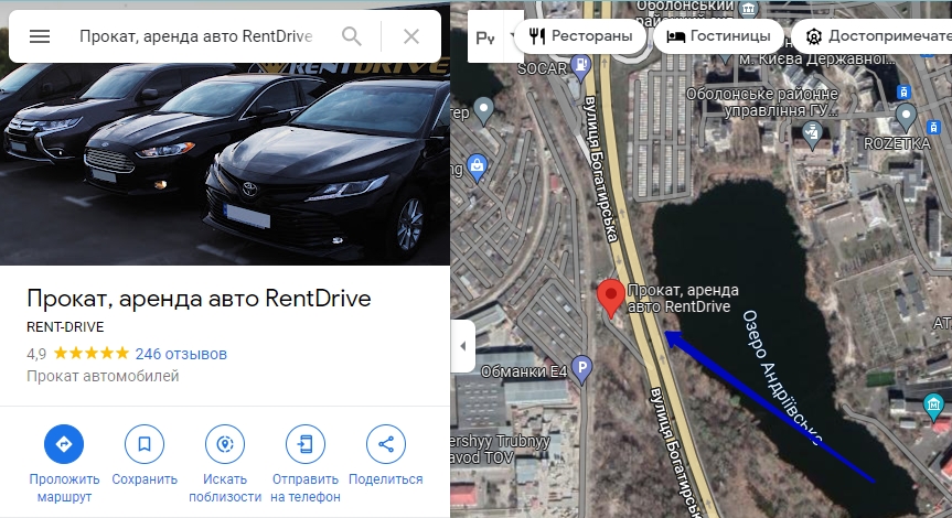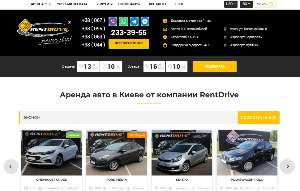 | Компания RentDrive – надежный партнер для всех, кому нужны авто на прокат. Мы предлагаем своим клиентам демократическую ценовую политику, позволяющую каждому выбрать именно тот автомобиль, который подходит ему по параметрам и финансовым возможностям. Наш головной офис расположен по адресу мисо Киев, улица Богатырская, 1Г. Все детали можете найти на сайте https://rentdrive.ua/ или задать вопрос менеджерам, телефоны 044 233 39 55, 063 233 39 55, 067 233 39 55, 095 233 39 55.